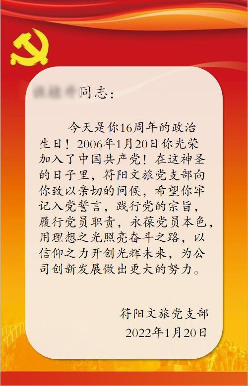 為進一步強化黨員黨性教育,增強黨員政治身份認同感,發(fā)揮黨員先鋒模范作用,符陽文旅黨支部為每位黨員過好...